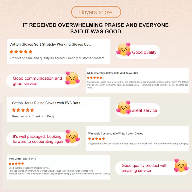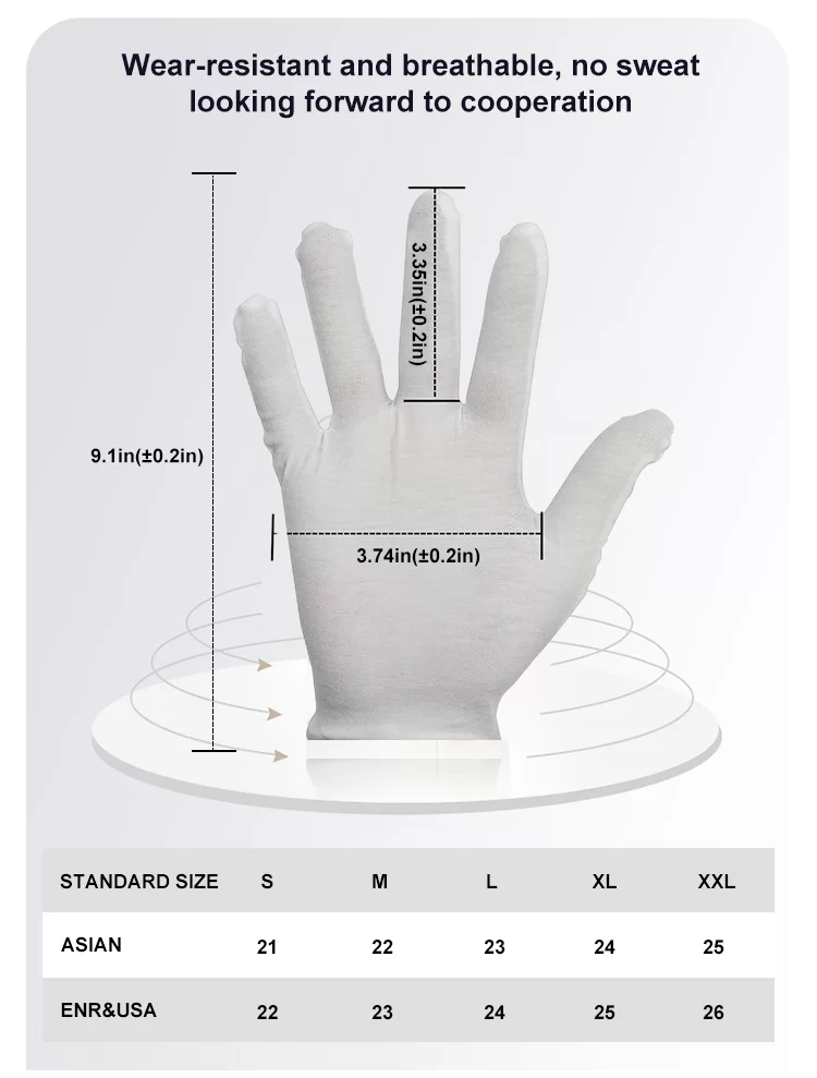Les tissus courants pour les gants d’étiquette comprennent du coton pur, des mélanges en polyester-coton, du nylon, du coton mercerisé, etc., qui équilibrent le confort et la raideur. La couleur est généralement du blanc pur, mais il existe également des styles personnalisés Téléphones que le noir et le bleu marine pour répondre aux besoins de différents uniformes et scénarios. En termes de coupe, il adopte principalement un design bien ajusté, correspondant à la forme de la main et aux coutures du corps humain. La partie du doigt s’adapte plus naturellement, ce qui le rend plus confortable et confortable à porter, avec des mouvements lisses et sans retenue.