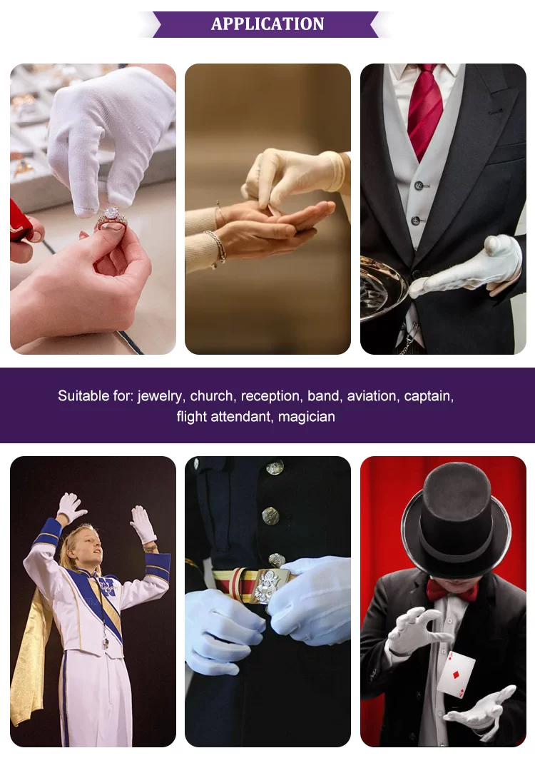 Les gants de cérémonie, en tant qu’accessoire de vêtements avec un sentiment de cérémonie et d’atmosphère formelle, sont largement utilisés à diverses occasions importantes, notamment les gardes d’honneur militaires et policières, le gouvernement et l’entreprise accueillants et la réception, les services de conférence de l’hôTéléphone, les performances culturelles, l’hébergement de cérémonie et la réception des expositions haut de gamme, et non seulement la tradition et la tradition de la manifestation de son statut, mais aussi de la tradition de la tradition et de la manière dont le manifestation de son état normes.